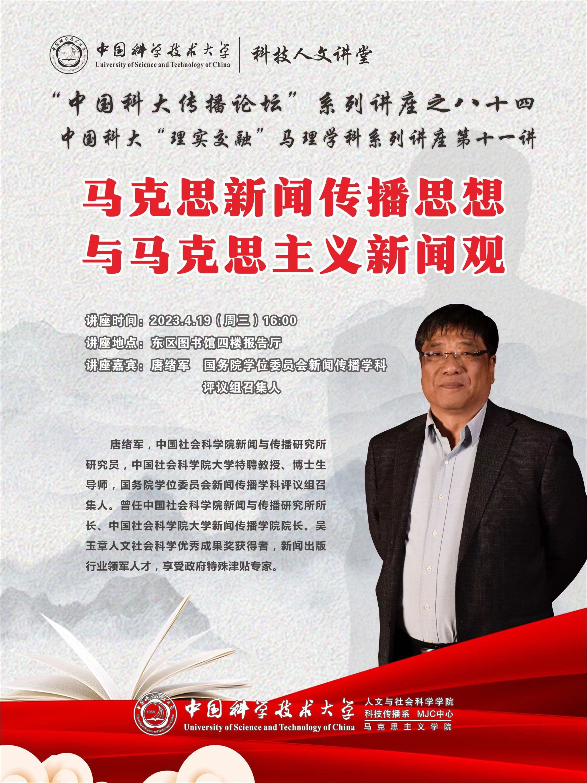 定于4月19日下午4:00,在东区图书馆四楼报告厅举办“中国科大传播论坛”,特邀国务院学位委员会新闻传播学科评议组召集人,中国社会科学院新闻与传播研究所研究员,中国社会科学院大学特聘教授、博士生导师唐绪军做主题报告,欢迎全校感兴趣师生参加。