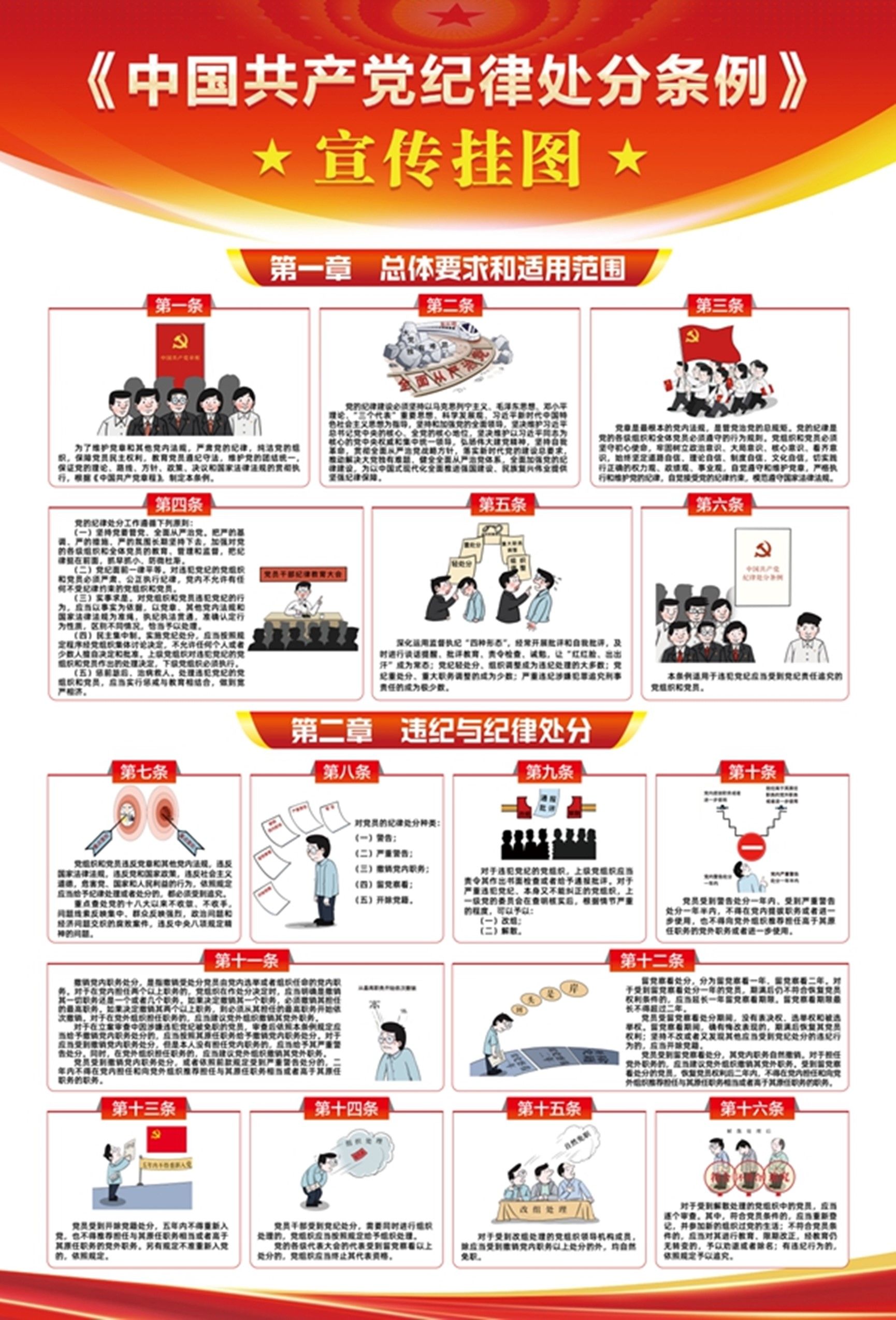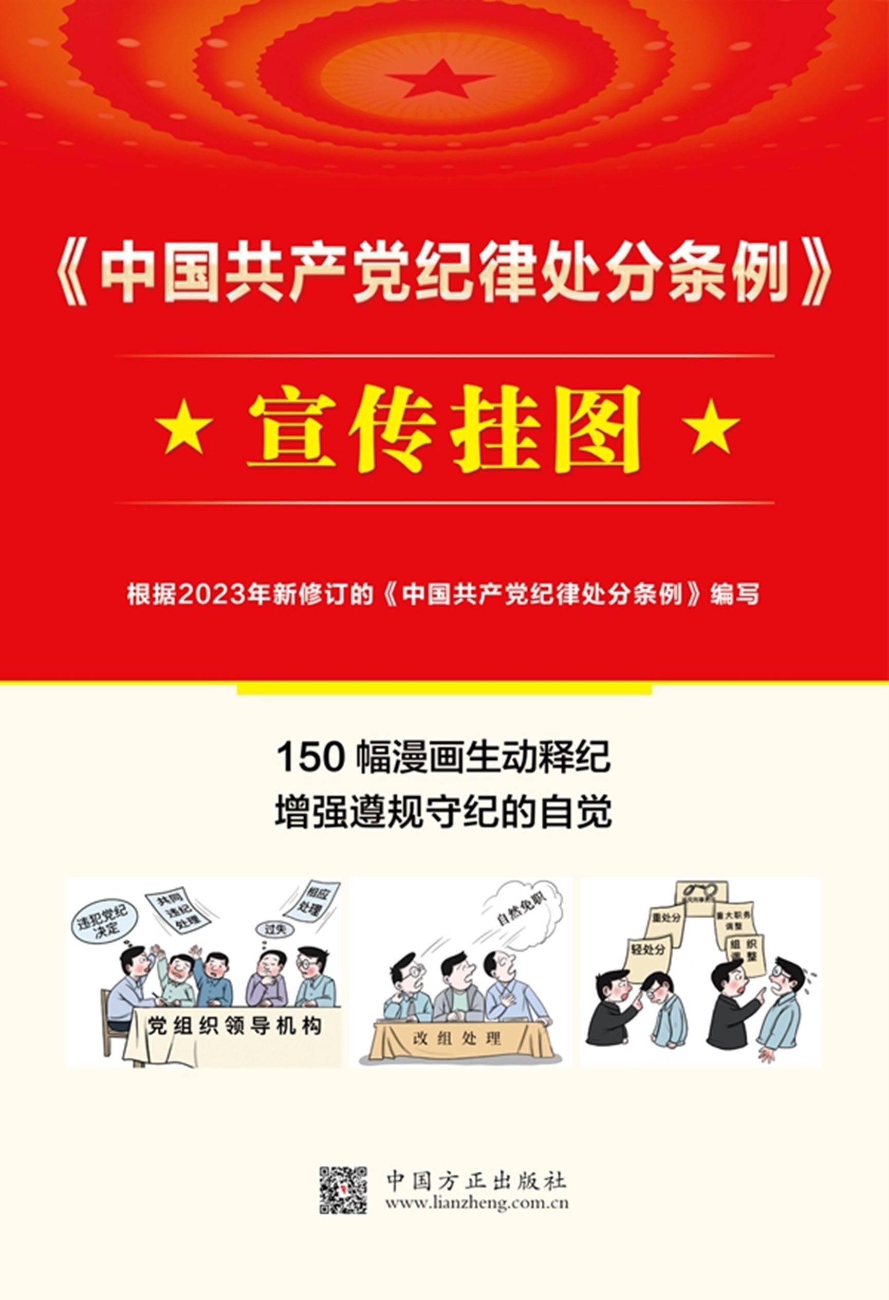 宣传挂图由中央纪委国家监委中国方正出版社出版,共10张150幅漫画,逐条阐释和宣传《条例》具体内容,重点突出明令禁止的负面行为,生动阐释了党员、干部能干什么、不能干什么,是普及纪律知识的生动载体。