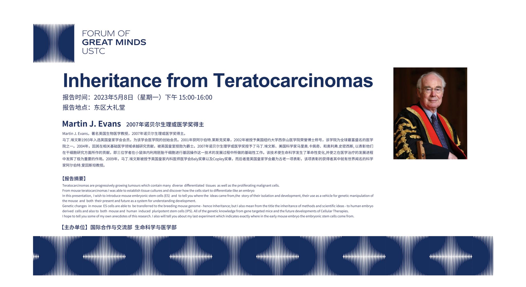 应学校邀请,著名英国生物医学家、2007年诺贝尔生理或医学奖得主Martin J. Evans教授将于2023年5月8日来校作“Inheritance from Teratocarcinomas”学术报告。