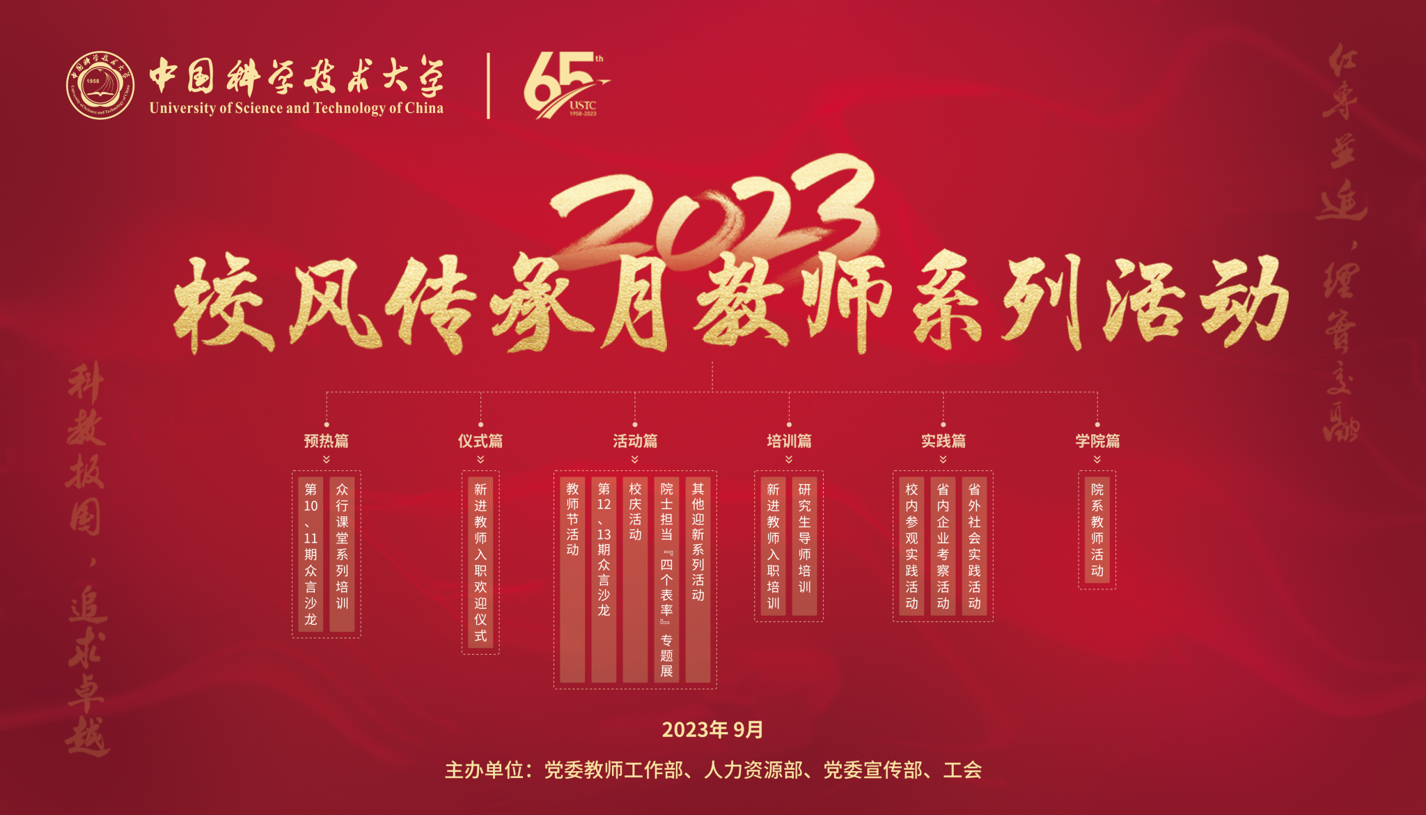 在第39个教师节和65周年校庆来临之际,根据教育部及安徽省有关文件精神,为进一步加强新形势下师德师风建设,教育引导广大教师传承优良校风,涵养高尚师德,学校决定在全校范围开展2023年校风传承月教师系列活动(活动详情请见附件1-4)。现将有关安排通知如下。