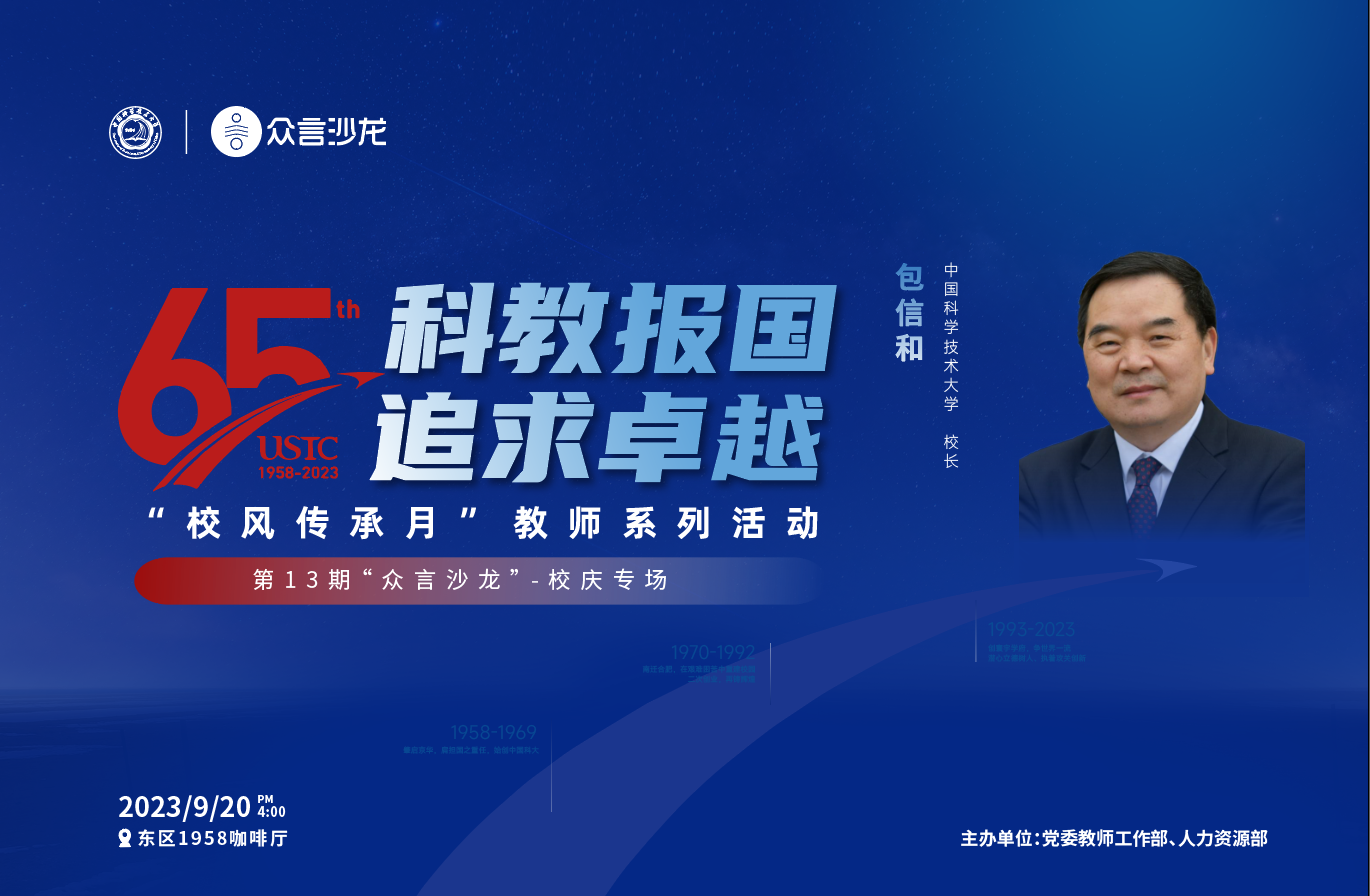 9月20日是中国科大建校65周年校庆日,作为开云足球校风传承月教师系列活动之一,第13期众言沙龙将以“科教报国,追求卓越”为主题举办校庆专场活动,邀请校长包信和作为嘉宾,与教职工代表进行面对面交流。