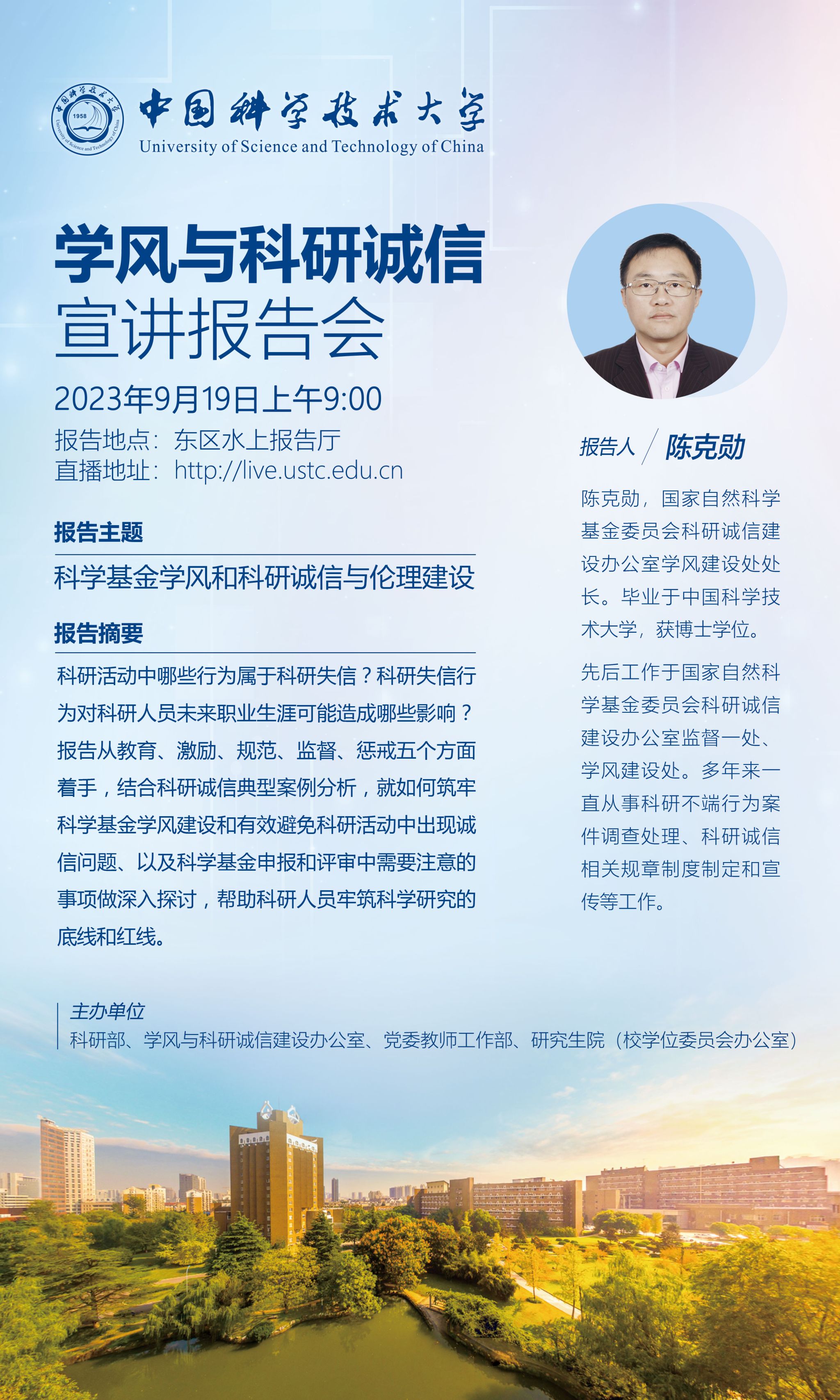 为进一步加强我校学风与科研诚信建设,增强广大科研人员的科研诚信和学术道德意识,营造良好的科研学术氛围,学校邀请国家基金委相关专家结合科研诚信典型案例作专题报告,就如何筑牢科学基金学风建设和有效避免科研活动中出现诚信问题、以及科学基金申报和评审中需要注意的事项为大家答疑解惑。欢迎广大科研人员积极参加!本次报告会将采取在线直播方式同时进行。