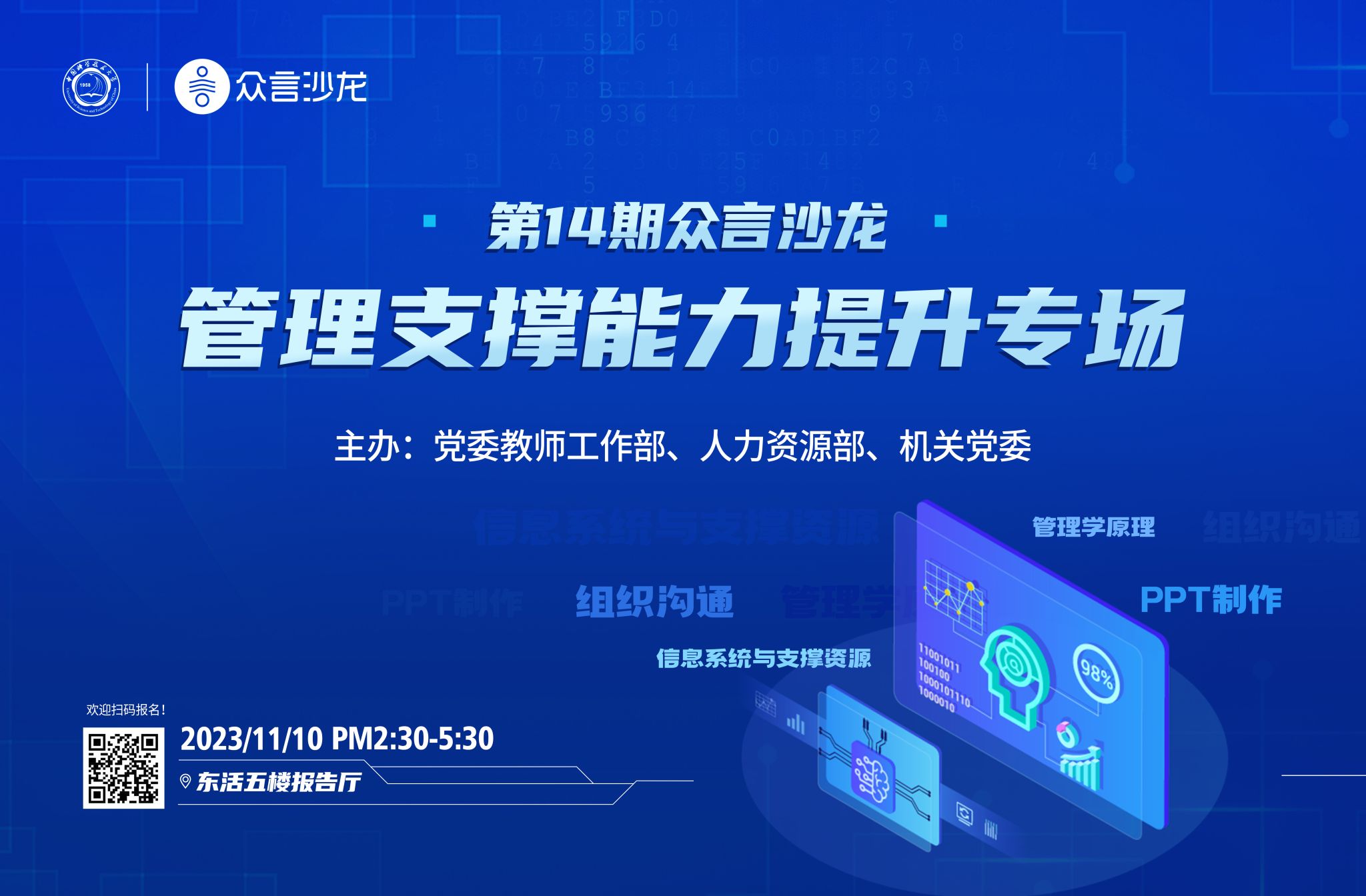 学校的发展建设离不开一支师德高尚、业务精湛、结构合理、充满活力的高素质专业化教师队伍。为进一步提升管理岗、支撑岗教师的管理水平和业务能力,加强跨部门合作交流,党委教师工作部、人力资源部、机关党委将联合举办第14期众言沙龙——管理支撑能力提升专场,围绕管理与沟通、PPT制作技巧、校内信息系统和支撑平台介绍等方面与大家面对面交流。
