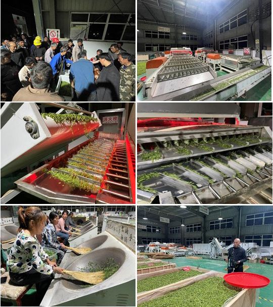 夜间,茶厂内灯火通明,周边来的茶农络绎不绝,学校援建的炒茶机械已开足马力加工芽茶鲜叶,而炒茶师傅们忙着把刚刚上市的瓜片鲜叶手工炒制,不期而至的自媒体新农人借用场地在直播间讲解高山老树茶。