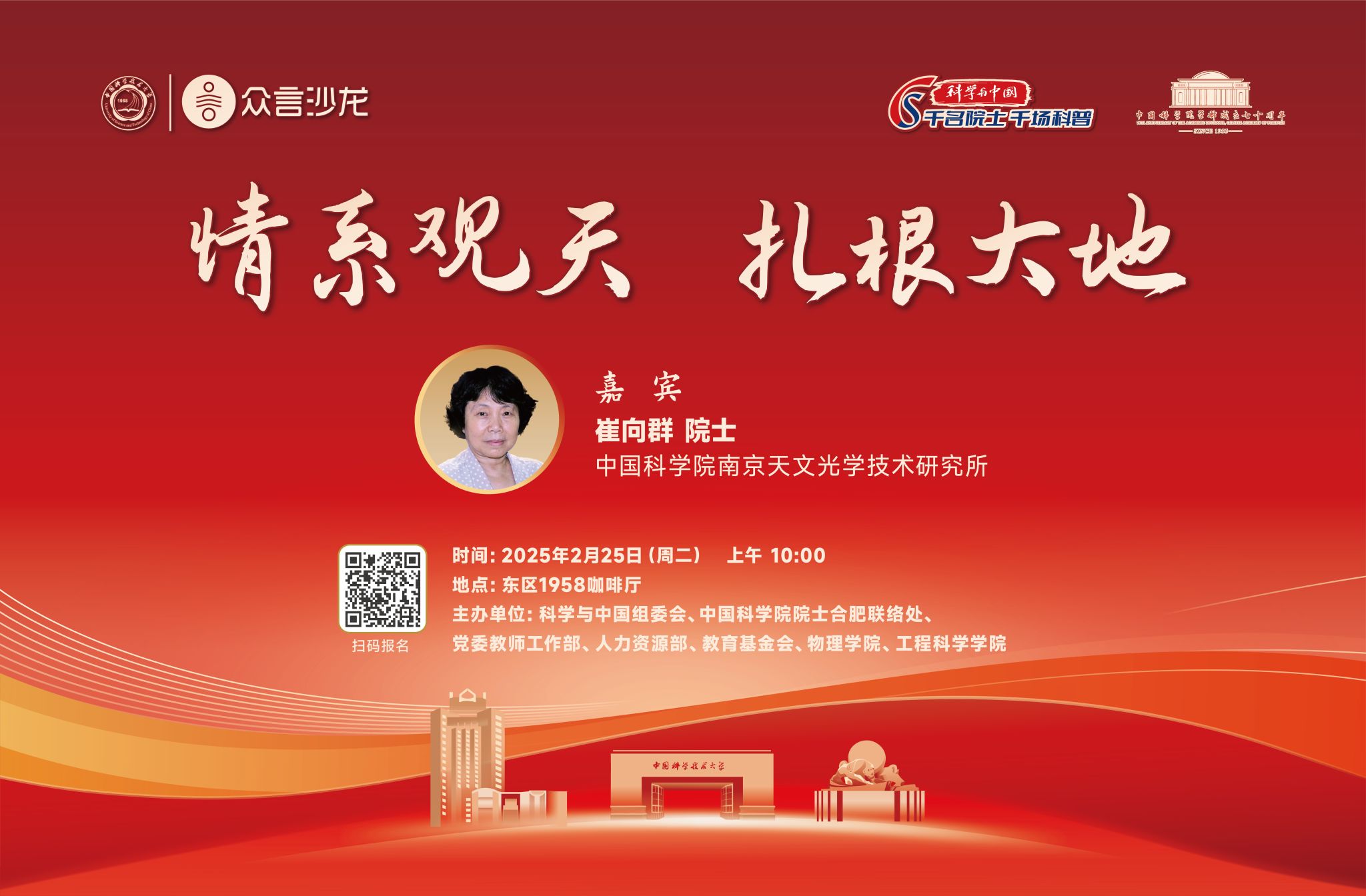 2025年是中国科学院学部成立70周年,为弘扬科学精神,讲述院士故事,营造热爱科学、崇尚创新的浓厚氛围,“科学与中国”——第26期“众言沙龙”活动将以“情系观天 扎根大地”为主题,邀请天文学家、中国科学院南京天文光学技术研究所崔向群院士作为嘉宾,与校内师生面对面交流。