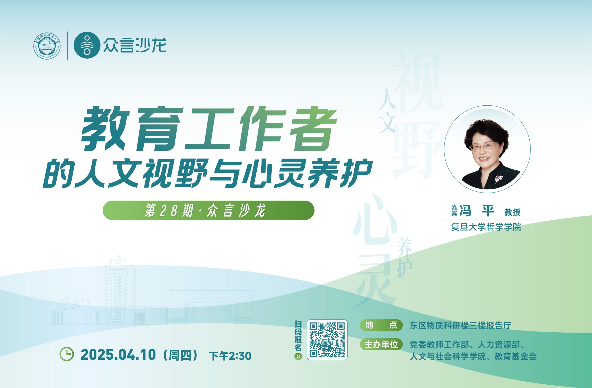 为提升教师业务能力和综合素质,加强对教师队伍的关心关爱,第28期“众言沙龙”将以“教育工作者的人文视野与心灵养护”为主题,邀请复旦大学哲学学院冯平教授作为嘉宾,与大家面对面交流。
