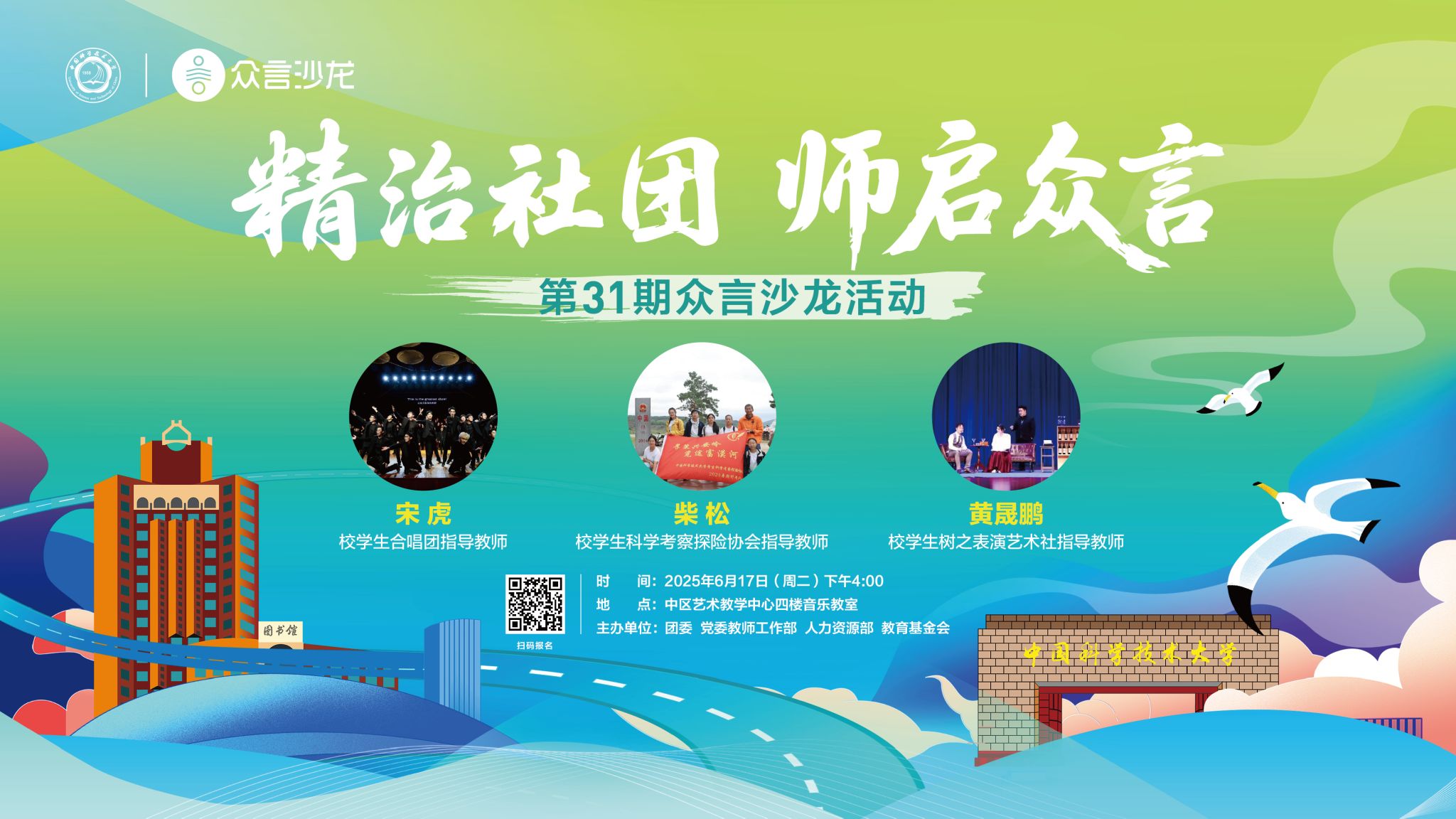 高校教师承担着立德树人的根本任务,学生社团是高校思想政治教育工作体系的重要一环。为加强学生社团日常管理和业务指导,提升教师指导社团建设和发展的能力,第31期“众言沙龙”将以“精治社团,师启众言”为主题,邀请校学生科学考察探险协会指导教师柴松、校学生合唱团指导教师宋虎、校学生树之表演艺术社指导教师黄晟鹏作为嘉宾,与大家面对面交流。