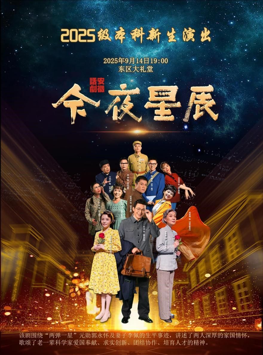 为大力弘扬老一辈科学家“两弹一星”精神,引导同学们传承红色基因、赓续科大精神、勇攀科学高峰,肩负起新一代中国科大人的责任和使命,本科生院面向学校2025级本科新生组织观看由安徽省话剧院创排的大型话剧《今夜星辰》,现将有关工作要求通知如下: