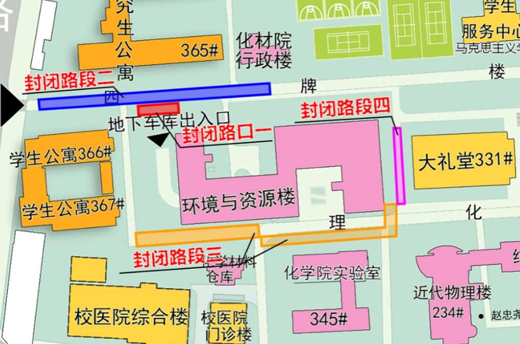 具体封闭范围详见附图,封闭区域内禁止车辆和行人通行,过往行人、车辆请选择就近绕行。施工期间存在的噪音和扬尘不可避免,施工给广大师生学习和工作带来不便,敬请谅解。(注:如遇特殊情况,以上计划封闭时间会根据学校要求及工程进度进行弹性调整)