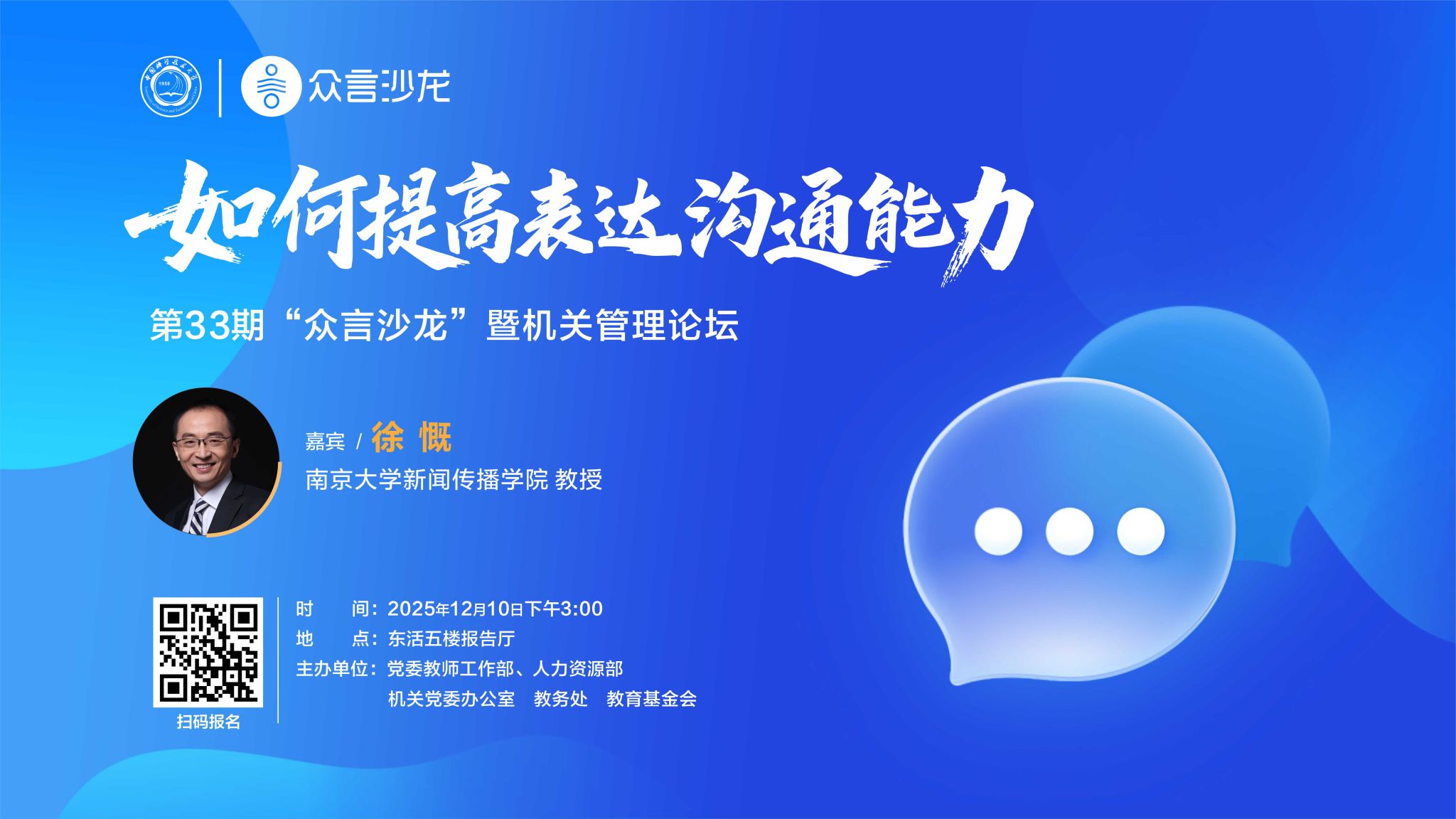 为增强教职工表达沟通能力,实现高质量师生交流和课堂互动,第33期“众言沙龙”暨机关管理论坛将以“如何提高表达沟通能力”为主题,邀请南京大学新闻传播学院徐慨教授作为嘉宾,与师生面对面交流。