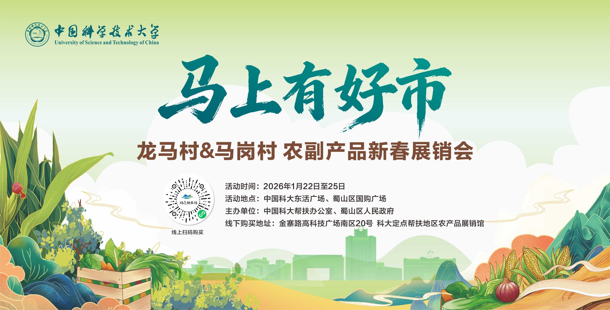 年关将至,年味渐浓。为助力乡村振兴,切实帮助我校定点帮扶地区优质农副产品拓宽销路,1月22日-23日,帮扶办公室携手蜀山区有关单位,在学校东活广场举办“马上有好市”(龙马村&马岗村)农副产品新春展销会;24日-25日,展销活动还将在蜀山区国购广场持续进行。