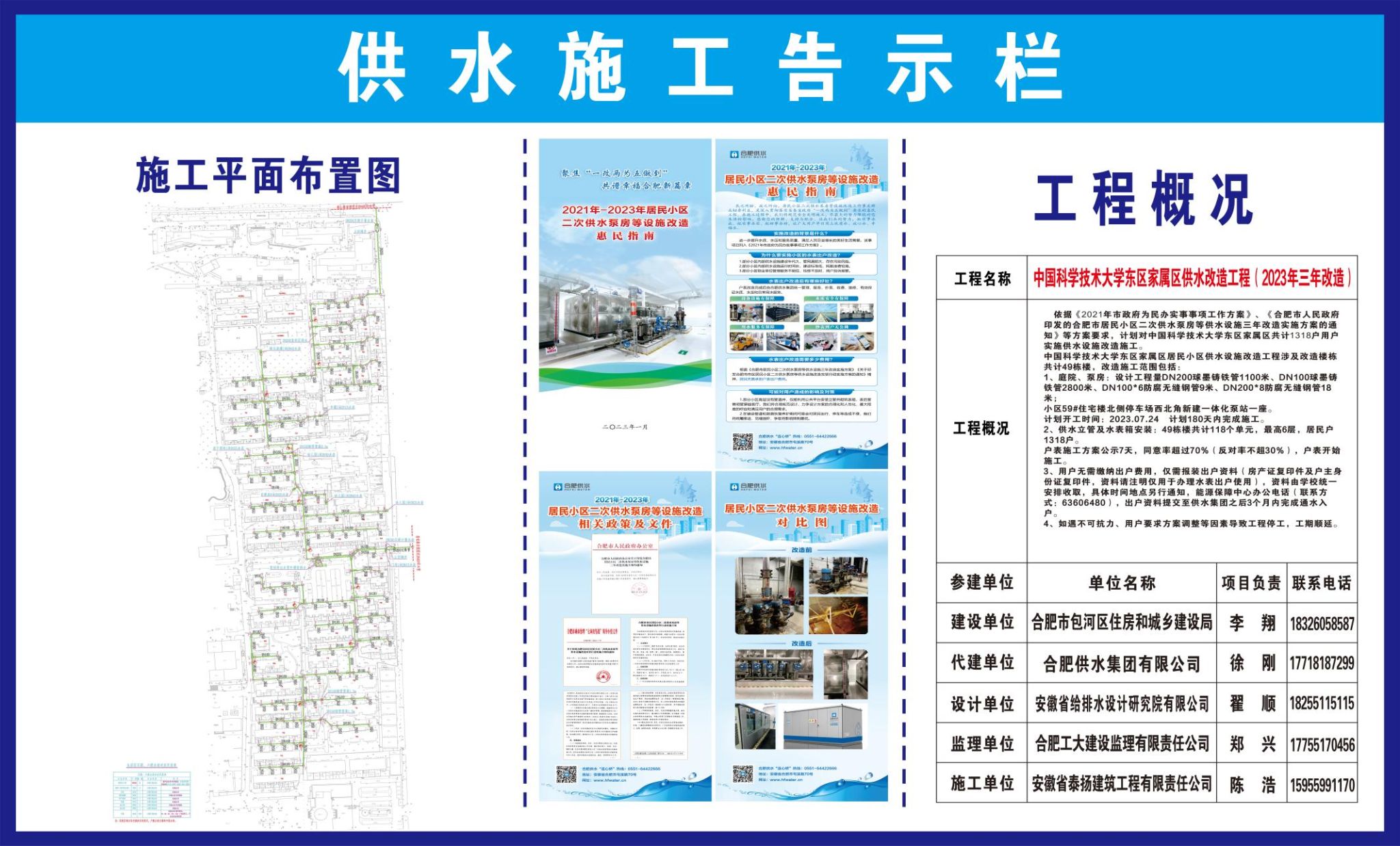 1.本次改造工程的建设单位为合肥市包河区住房和城乡建设局,代建单位为合肥供水集团有限公司。具体工程概况(见下图)将在家属区同步张贴公示,如有疑问,可电话咨询;